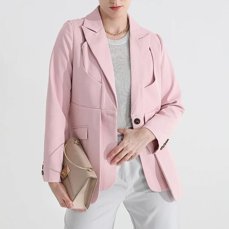 Women's Solid Color Blazer with Notched Collar and Unique Folds