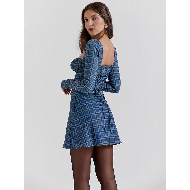 Chic Tartan Backless Mini Dress with Square Collar and Lace-Up Detail