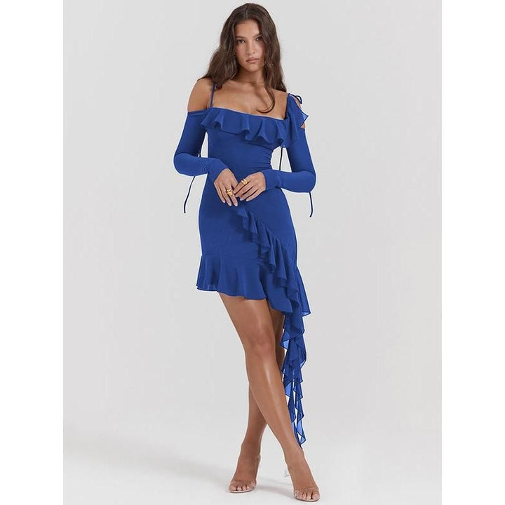 Our mini dress stands out with its unique slash neck and backless design, coupled with a charming ruffle detailing that adds a touch of sophistication. The full-length sleeves and above-knee cut create a balanced look that's both classy and daring. Crafted from a blend of high-quality polyester, spandex, and mesh, this dress offers a comfortable fit with medium stretch, ensuring you look and feel your best.