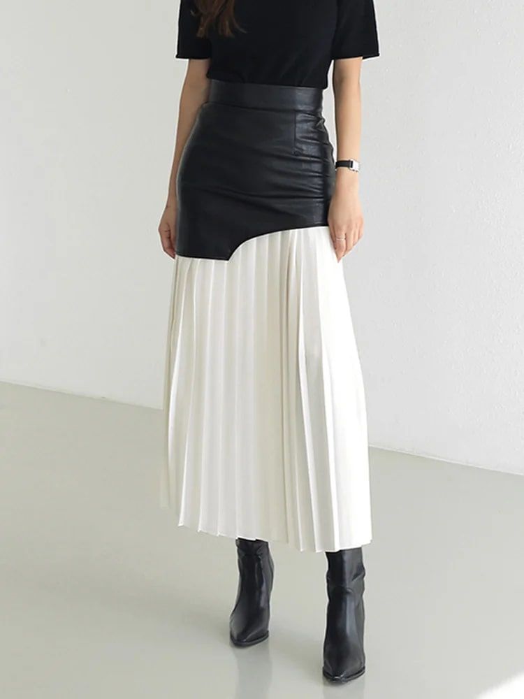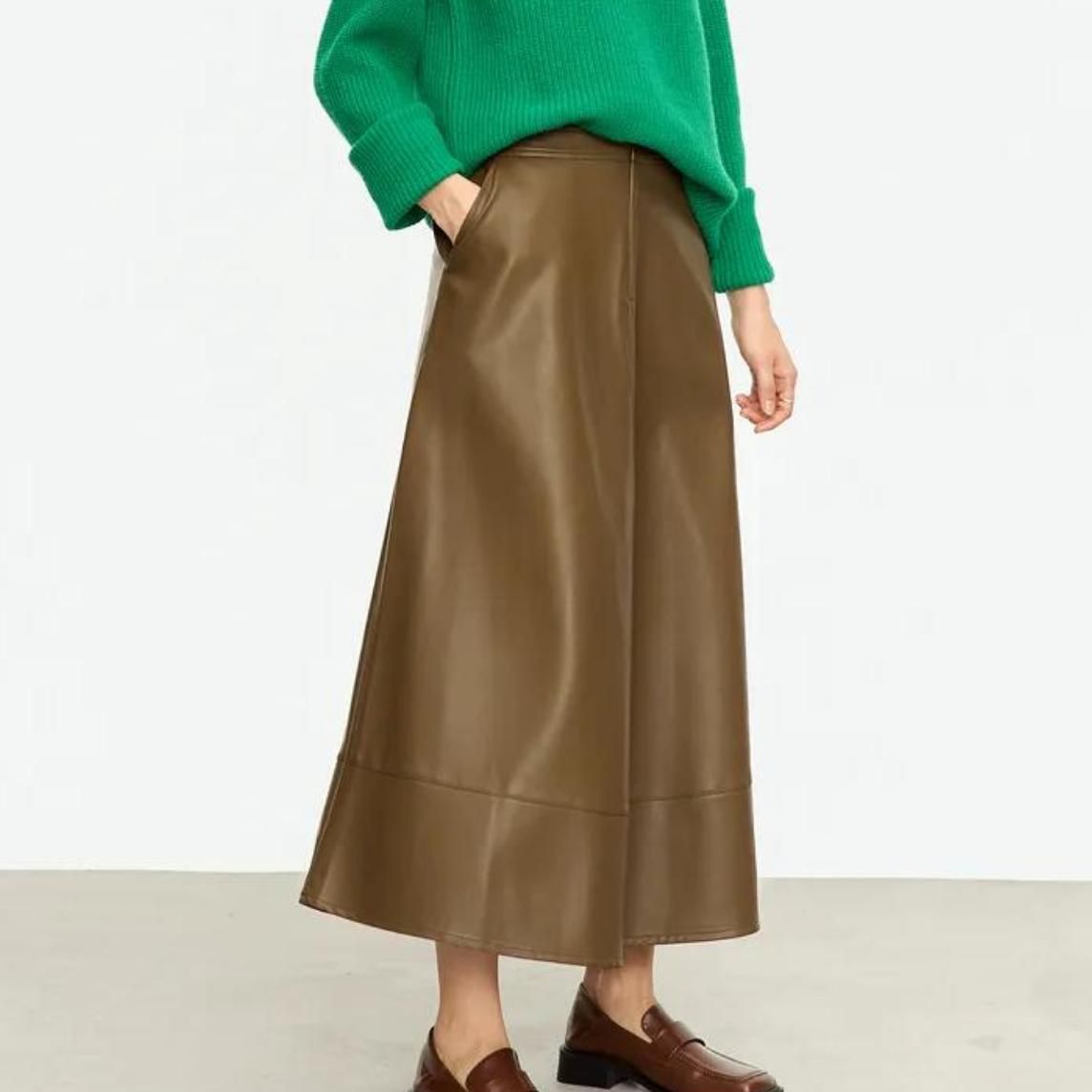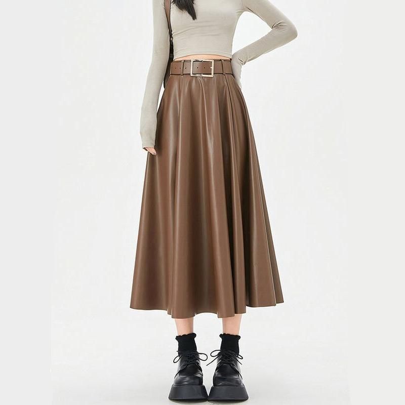Elegant Autumn Ankle-Length A-Line Leather Midi Skirt for Women