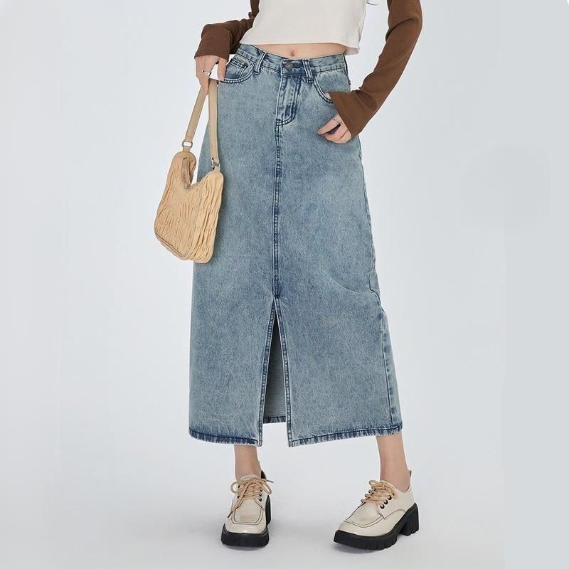 Chic Vintage Blue Denim Midi Skirt with Front Slit