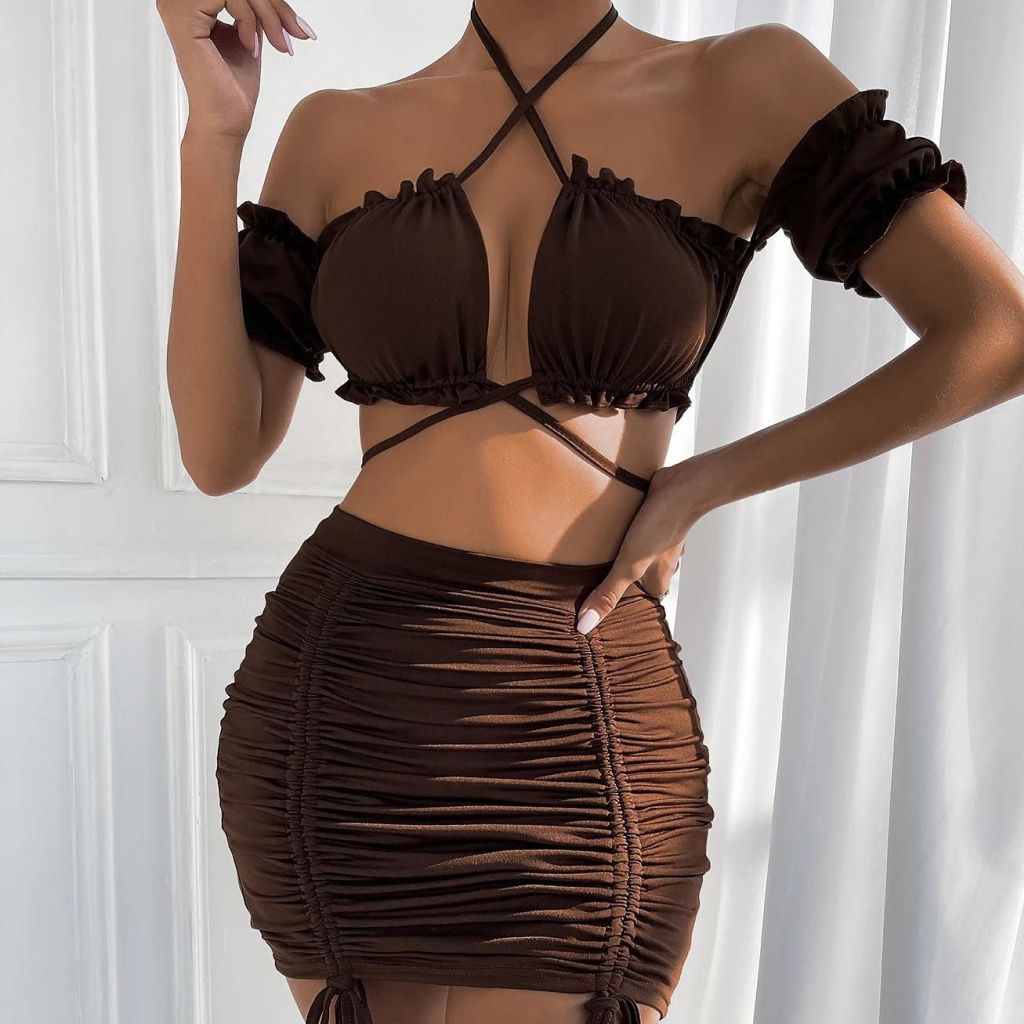 90s Retro Sequin 2-piece Skirt Set: Off-the-Shoulder Corset Top with Mini Pleated Skirt