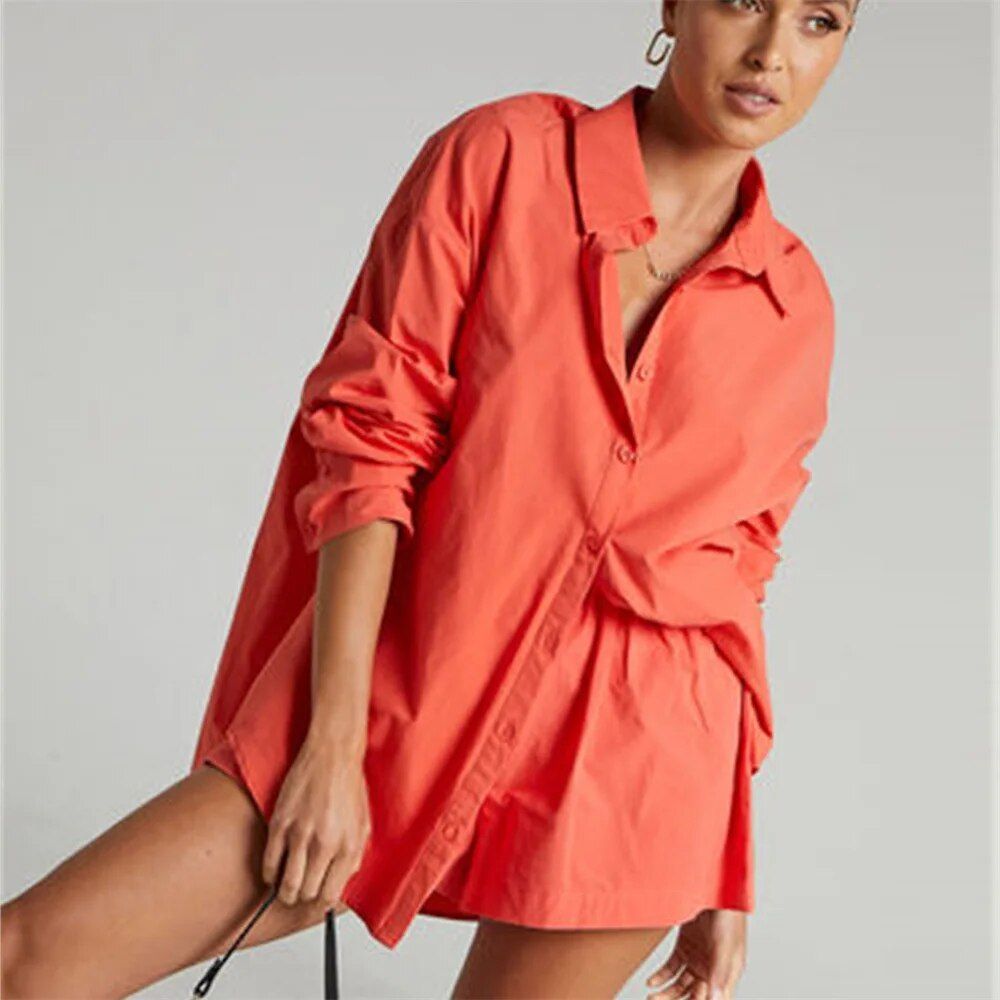 Embrace the summer with our latest arrival - a chic, high-waist shirt and shorts set that flawlessly blends style and comfort. Designed for the modern woman, this set is perfect for both office wear and casual outings. The turn-down collar and long sleeves add a touch of sophistication, making it an ideal choice for middle-aged women who appreciate elegance and style.Product Features