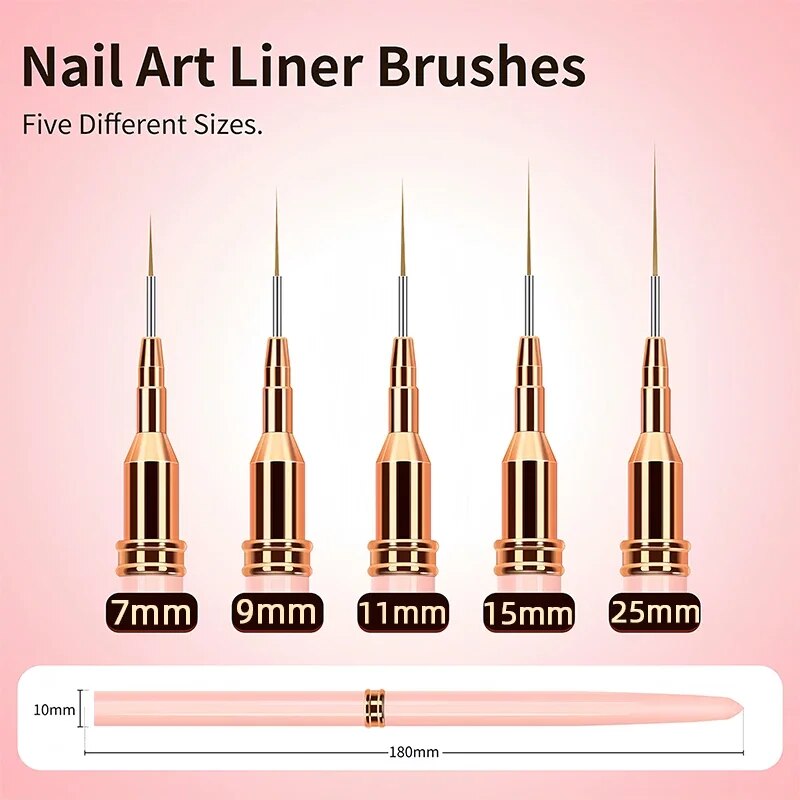 Introducing our 5-piece Nail Art Liner Brush Set, meticulously crafted to elevate your nail design game to new heights. Whether you're a seasoned nail artist or a budding enthusiast, these professional-grade brushes are your gateway to intricate patterns, delicate details, and flawless designs.