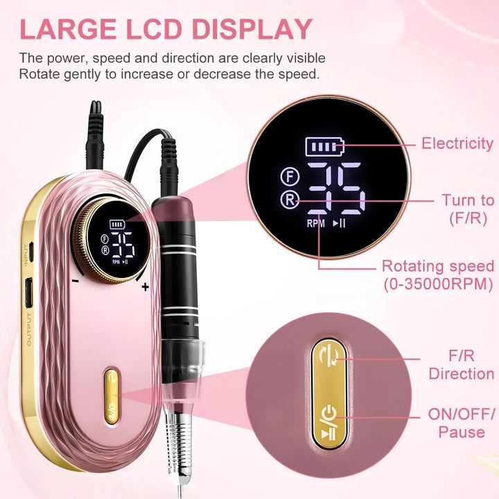The sleek design and advanced rose gold finish of our nail drill not only elevate your nail care experience but also provide a comfortable grip for precise handling. Its palm-sized handpiece allows for portability, so you can take it with you wherever you go.