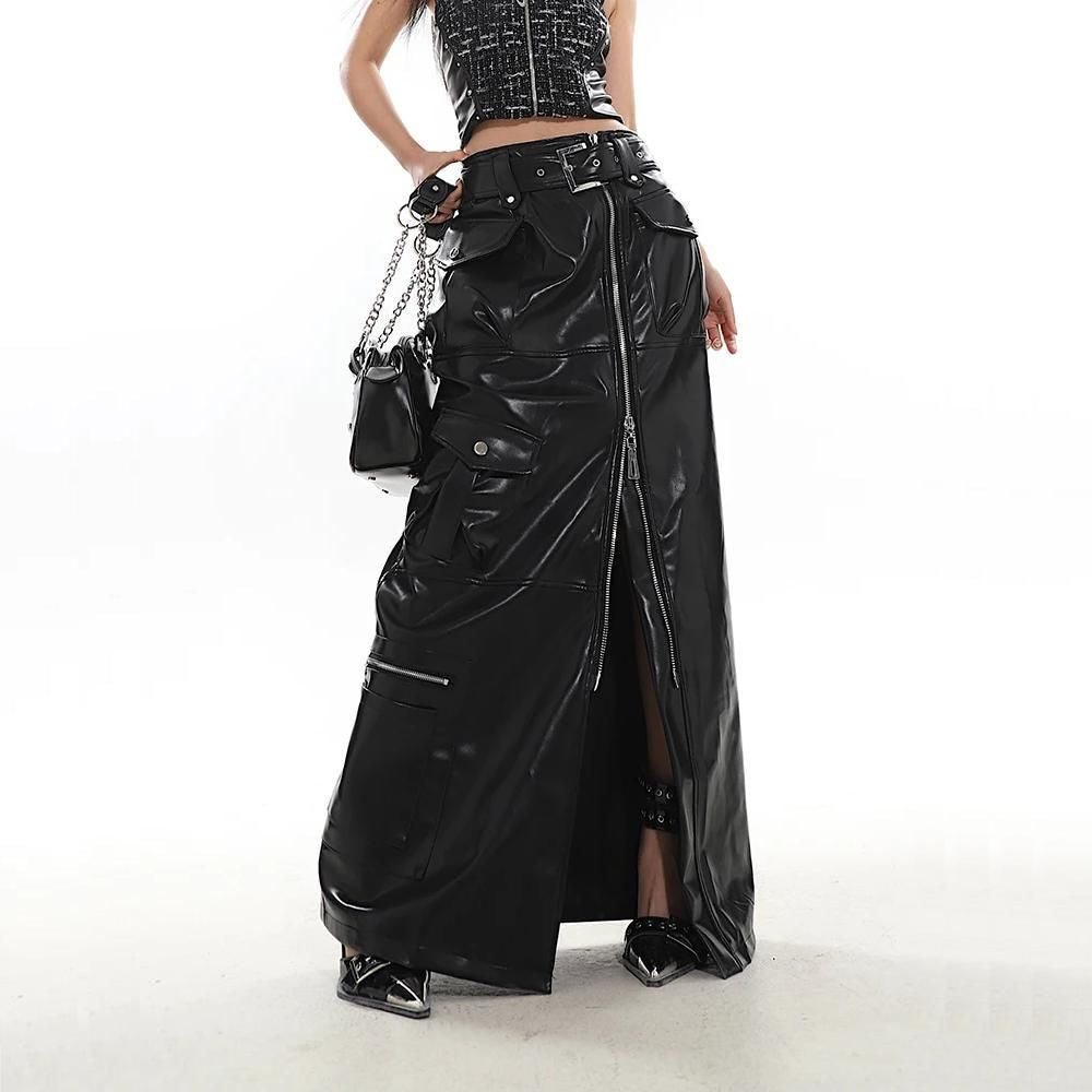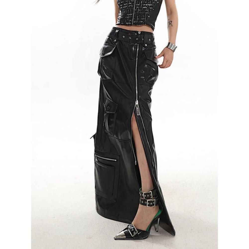 Elevate your style with our Spring 2024 New Tide Leather Skirt - a perfect blend of fashion and functionality. This A-line skirt is designed with a modern twist, featuring multiple pockets, a trendy split, and a long zipper for a touch of edgy sophistication.Key Features: